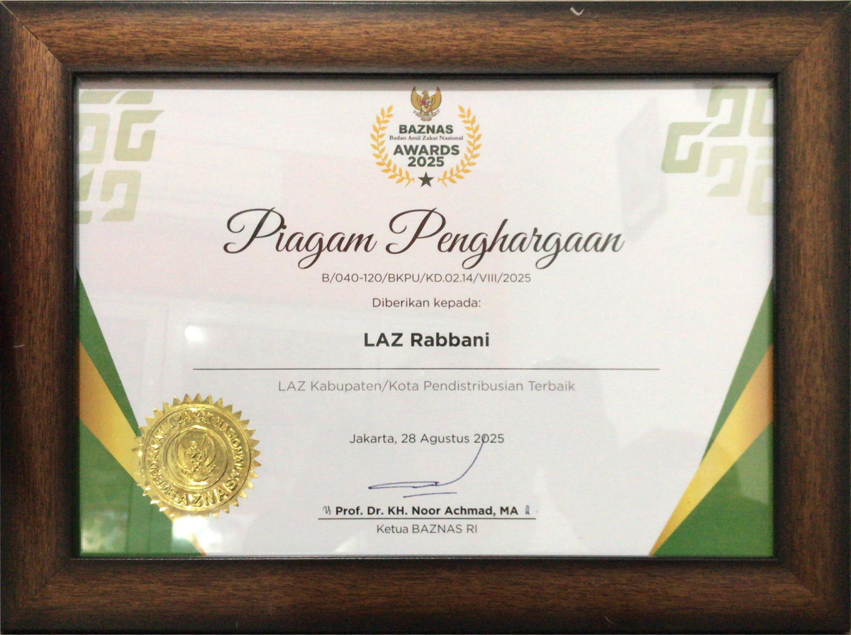 Piagam Penghargaan Dalam Kategori LAZ Kabupaten/Kota Pendistribusian Terbaik BAZNAS Award 2025